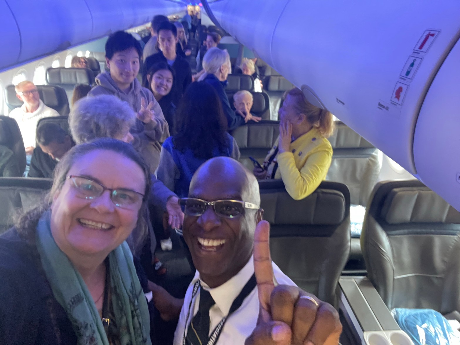 Captain Patrick was excited to see us boarding the plane. He gave his welcome in person rather than over the speaker system. We are the same passengers from last night’s fated flight. We reminisced over breakfast. We squeezed into the shuttle from the hotel. We have been together for hours and hours. And for the most part, we still have positive attitudes.