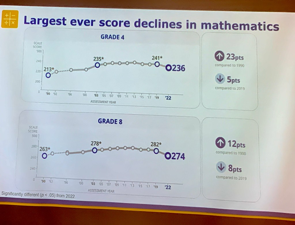 A disturbing report came from Ebony Walton and Grady Wilburn of the National Center for Education Statistics. They presented results from the recently released NAEP (National Assessment of Educational Progress) report. Learning loss since COVID is real. The decline in mathematics scores for grades 4 and 8 from 2019 to 2022, was the largest EVER (at least since the data have been collected.)
