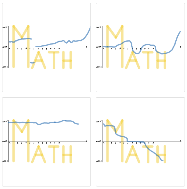 Yesterday afternoon, my #TacomaMath colleagues Jenn Crump, Ander Erickson, and I delivered a (virtual) professional development session for teachers in the Tacoma area. One of the activities was to graph our relationship to math over time. Some of the results are given below: