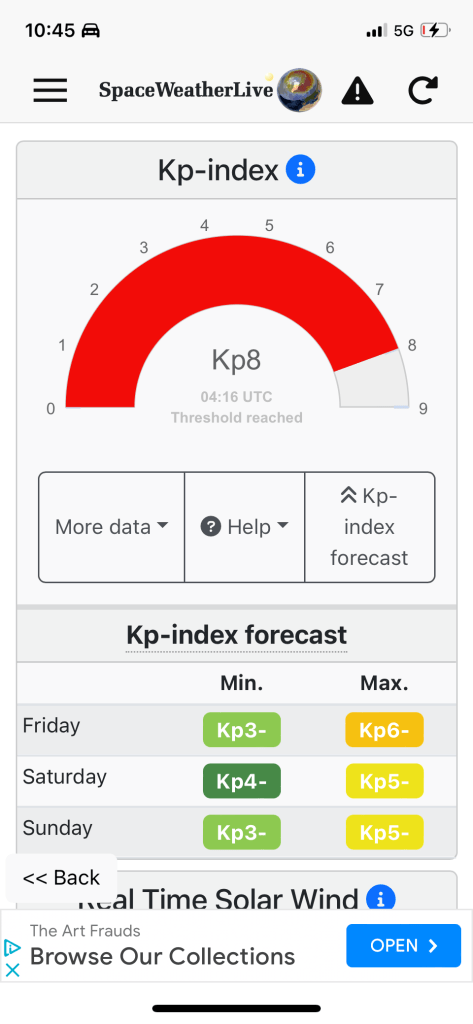 I have multiple apps on my phone that let me know when conditions are possible for viewing. In Washington state, even at the best of times, the Aurora is rarely visible with the naked eye. But sometimes it can be caught on camera. Last night all indications were strong for a visible aurora EXCEPT for the cloud cover. The geomagnetic alerts on my apps were pinging wildly. The Kp index, which describes the disturbance of the Earth’s magnetic field caused by the solar wind, indicated a severe solar storm. The Bz, which gives the direction of the interplanetary magnetic field, was negative. Since Earth’s magnetic field lines point north, when the incoming interplanetary magnetic field turns south (meaning negative Bz), the fields interact. Charged electrons from the solar wind collide with earth’s atmosphere and an aurora is born.