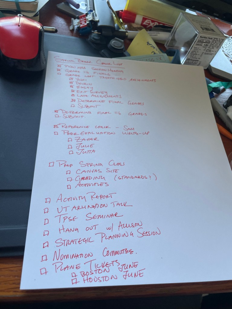 I am grateful that all but one item has since been checked off. The “prepare spring class” items were a near thing. I am teaching Trigonometry again (last quarter was my first time teaching it in 15 years at this institution) but I was not completely satisfied with the outcome. Rather than making minor tweaks, I’m challenging myself to revamp the whole thing using mastery-based assessments and even more active learning.