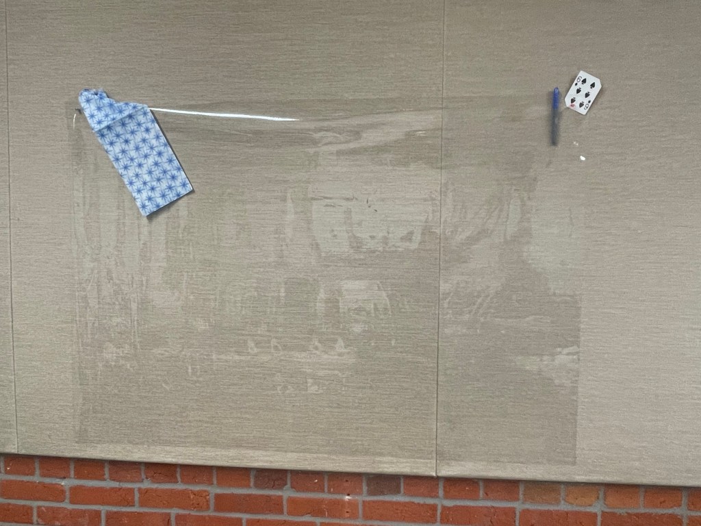 The cover image is of 6 vinyl sheets thumbtacked to the back wall —giving me a total of 10 vertical nonPermanent surface (VNPS) stations (including the white boards in front) for groups of students to work together. Each station had a fine point dry erase marker, an erasing cloth, and a playing card to indicate group number.