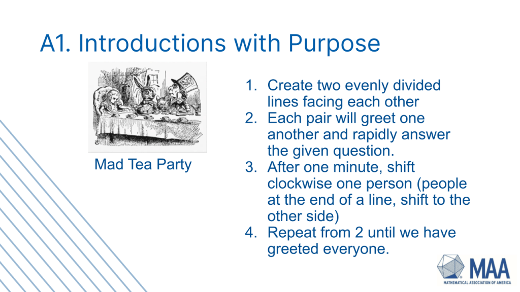 At my last MAA Board meeting as president (November 2022), our ice breaker was a Liberating Structure Mad Tea Party, which aligned with our need to begin preparing a new strategic plan. It allowed us to greet one another personally and briefly discuss leading prompts (16 of them, a different one for each person you met).