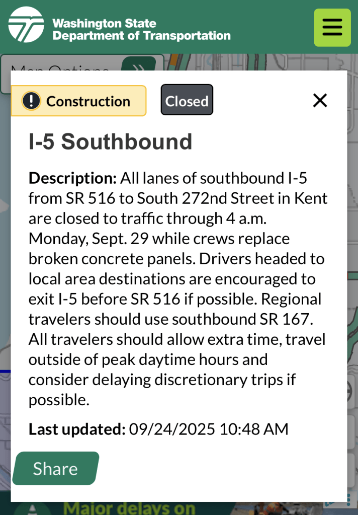 I knew Saturday night had the potential for being a horrible ride home from Seattle. On my northbound journey towards the city at 3:30 pm that afternoon, I saw that all southbound lanes of I-5 were shut down. Traffic was backed up for miles being diverted onto surface streets. The Washington State Department of Transportation scheduled major roadwork on the southbound lanes all weekend long. Which meant one thing: my return trip was going to be complicated.